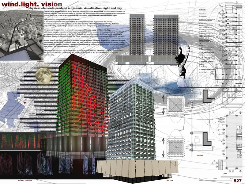 GreekArchitects.gr and DuPont Hellas S.A. sponsored the architectural competition “Piraeus Tower 2010 – changing the face/facade reformation.” The competition objectives were to investigate ways with which the Piraeus Tower–a 22-story, 84-meters tall building that is abandoned for more than 30 years–can be utilized and become an important architectural building, not only for the city of Piraeus, but for the whole metropolitan area of Athens.