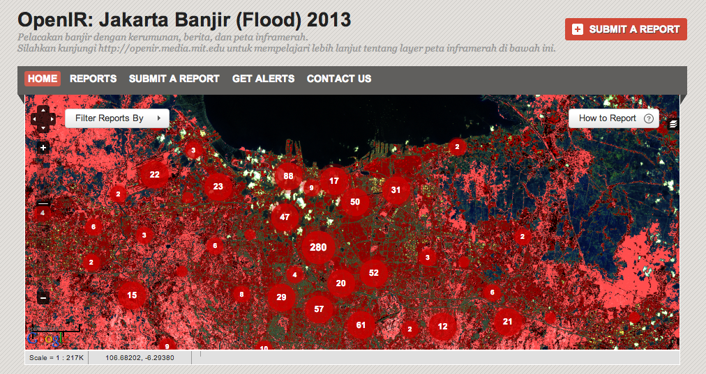 Screenshot of OpenIR’s Jakarta 2013 Ushahidi deployment, which tracked crowd reports during the severe floods, and overlaid them on top of OpenIR’s Flood Vulnerability Index Map.