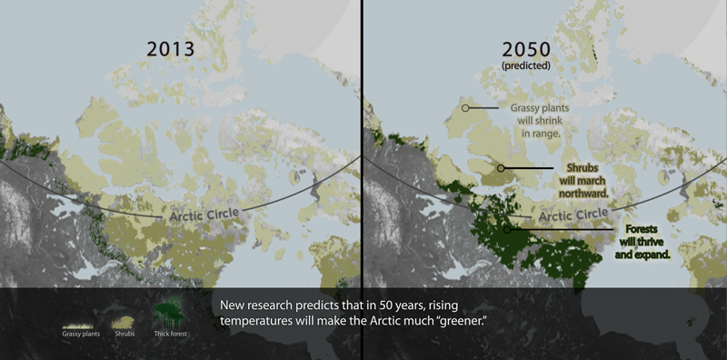 A new visualization by the DuKode Studio for AMNH. In the Arctic, where air temperatures are rising at about twice the global rate, scientists are seeing major shifts in plant life…